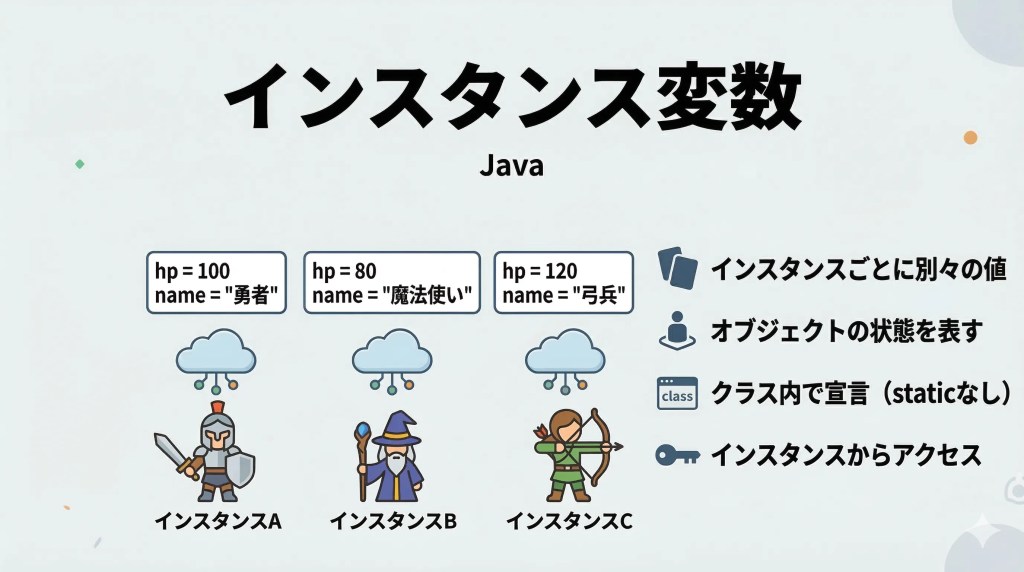 | ローカル変数 | メソッド内 | そのメソッドのみ | 必ず自分で初期化 | 一時的な処理 |